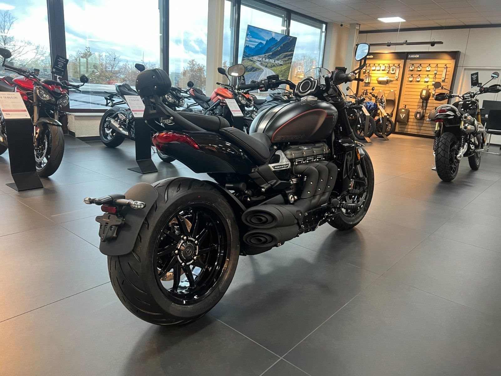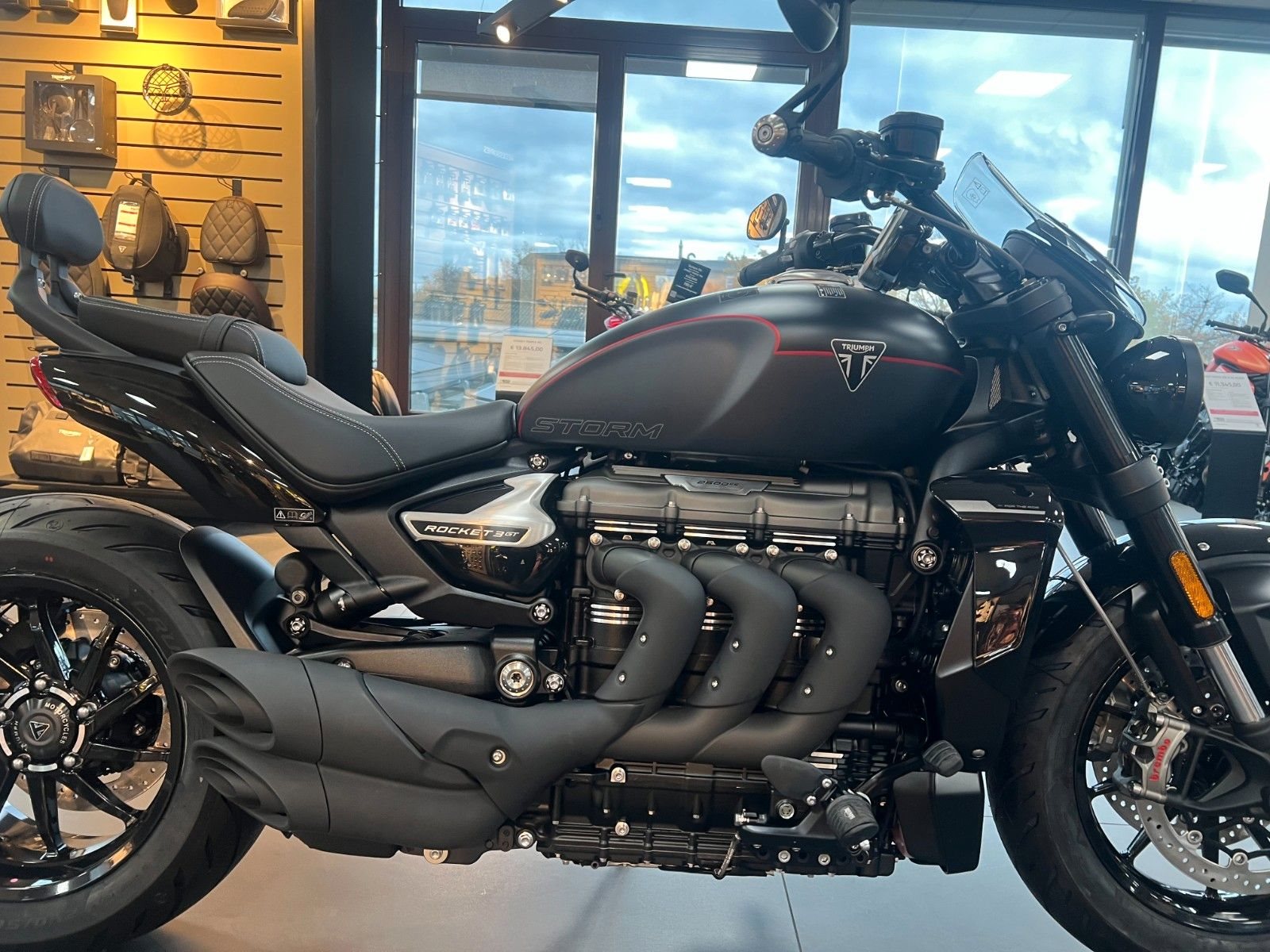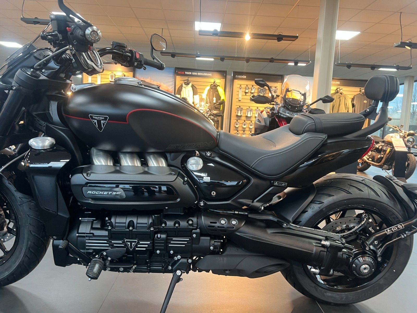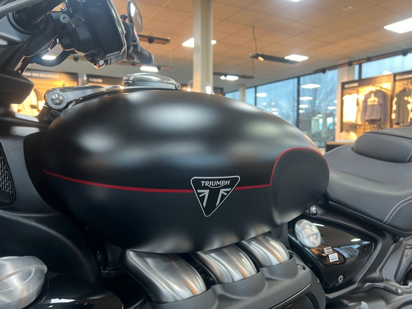 Besonderheit der Lackierung Die zweifarbige Kombination aus Matt Sapphire Black und Satin Granite wirkt extrem hochwertig und modern. Die dezente rote Tanklinie ist ein echtes Design-Detail - klein, aber auffällig genug, um der Rocket 3 GT eine sportlich-exklusive Note zu geben, ohne den Gesamtlook zu überladen.